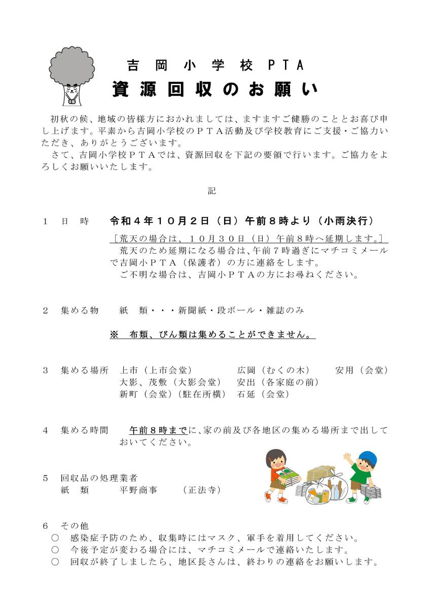 さて、明日(10月2日)は、PTA資源回収日(←クリック)です。ご協力をよろしくお願いいたします。